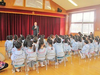 みんなで第三学期終業式をお遊戯室で行いました。