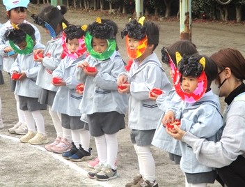 一生懸命作った鬼のお面をつけて豆まきをしました。