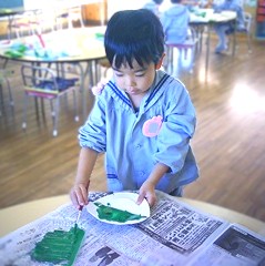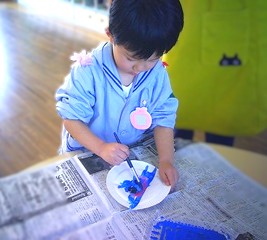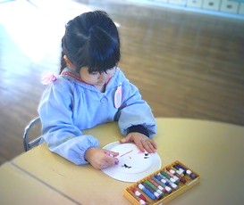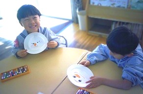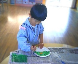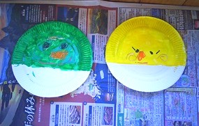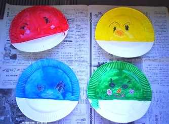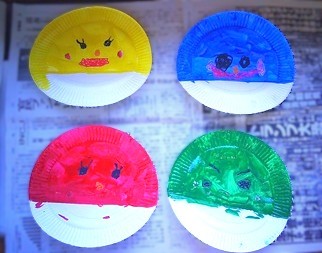 紙皿に鬼の顔を描き、絵の具を塗ってはじき絵にします。