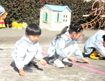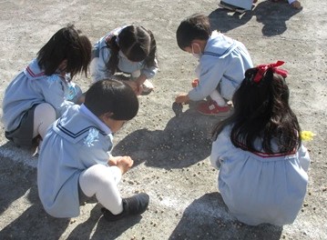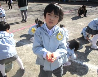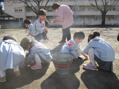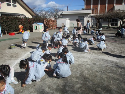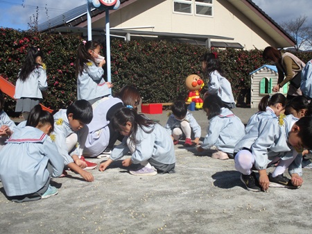 昨日の豆まきで蒔いたお豆が、園庭にたくさん落ちている・・・。