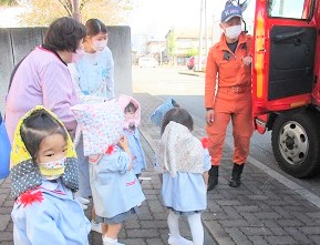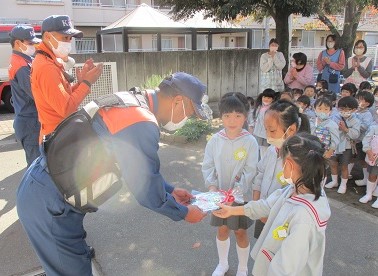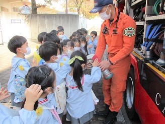 最後に消防隊の方々に年長さんが描いた「ありがとうの盾」を