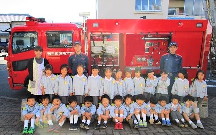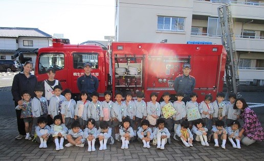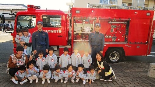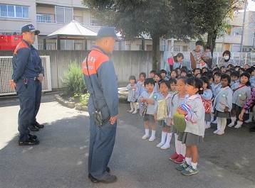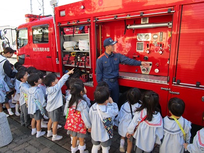 最後に消防隊の方々に年長さんが描いた絵付き金メダルをプレゼントして