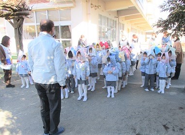 給食室からの出火を想定し、園庭に避難しました。