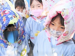 すごい風!!寒い中での避難訓練。
