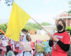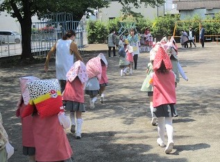 防災ずきんをかぶり、誘導旗を目指して園庭に避難をしました。