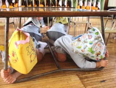 クッションをかぶり机の下へ避難をします。