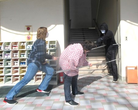 さすまたで攻撃です。