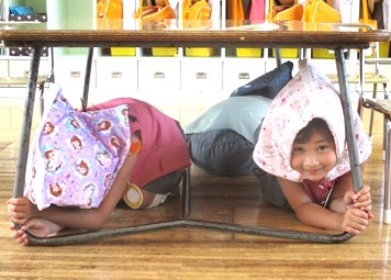 訓練の合図に大きな鐘の音がなり、机の下に隠れます。
