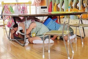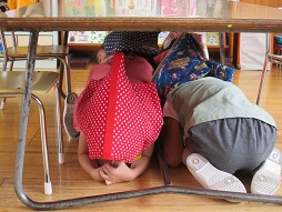 クッションをかぶり机の下へ避難をします。