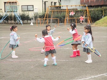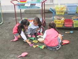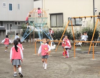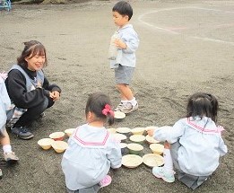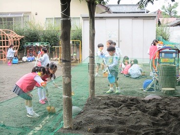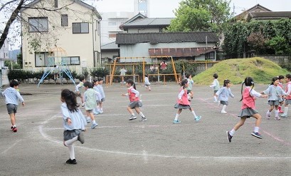 今日の避難訓練は、園庭で楽しく遊んでいるところ・・・・