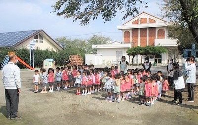 今月は、園庭で遊んでいるときに「給食室からの出火」という設定での避難訓練でした。