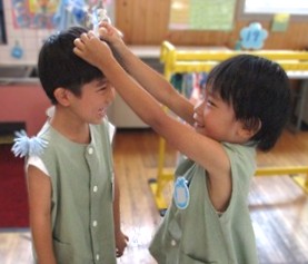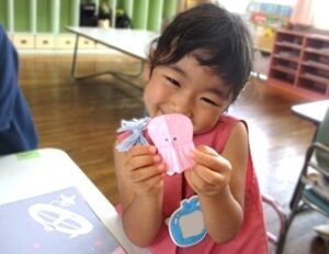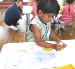 出来上がった宇宙人やロケットで遊んでから糊付けをしました。