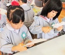 三角に折った画用紙を自分の好きな形に切っていきます