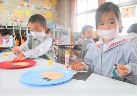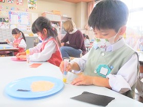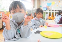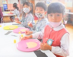 自分の顔をイメージしながら、お盆に折り紙をちぎって貼り、