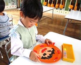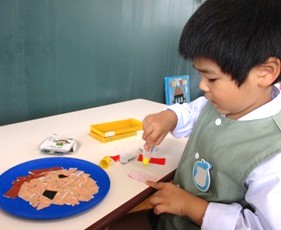 自分の顔をイメージしながらお盆に折り紙をちぎって貼り、形にしていきました。