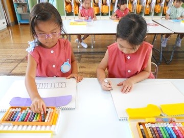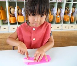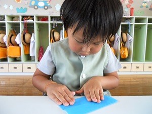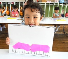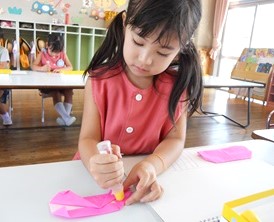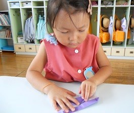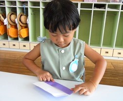 自分の好きな色の折り紙を選び電車を折りました。