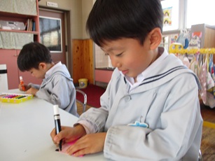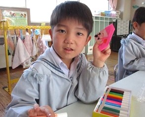 お雛様を折り紙で折り、お顔や着物の模様を描いてみました。