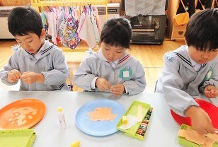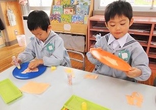 自分の顔をイメージしながら、お盆に折り紙をちぎって貼り、