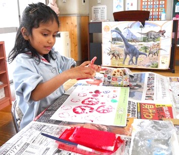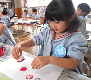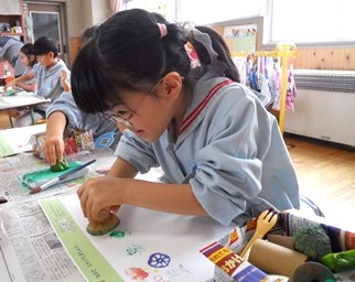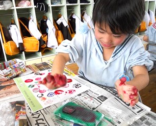 素材に絵の具を塗り、どんどんスタンプしていきます!