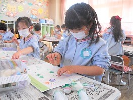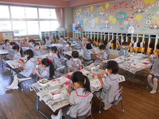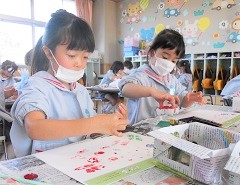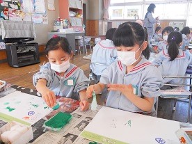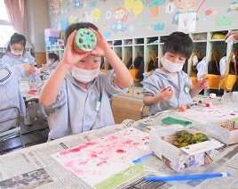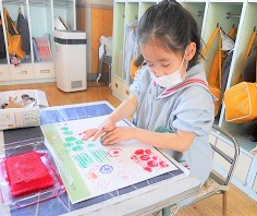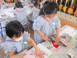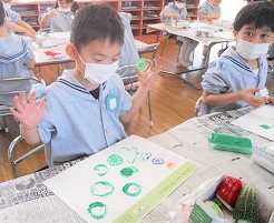 素材に絵の具を塗り、どんどんスタンプしていきます!