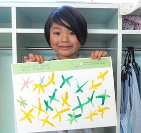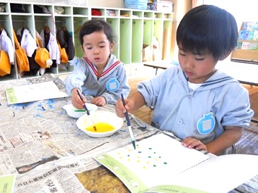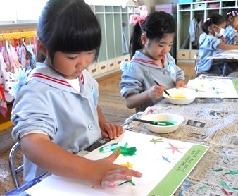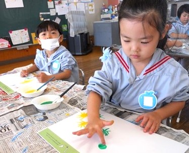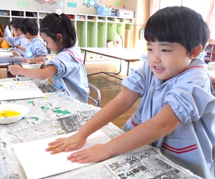 ゆるく溶かした黄色と緑色の絵の具を指につけて、