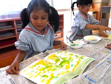 色で遊び、想像し、感覚を豊かにする絵の具遊び。