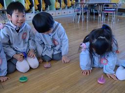 先日 製作したコマをクラスみんなでまわして遊びました。
