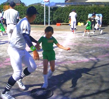 野球部のお兄さんたちと一緒にまずは準備体操を兼ねて鬼ごっこです。